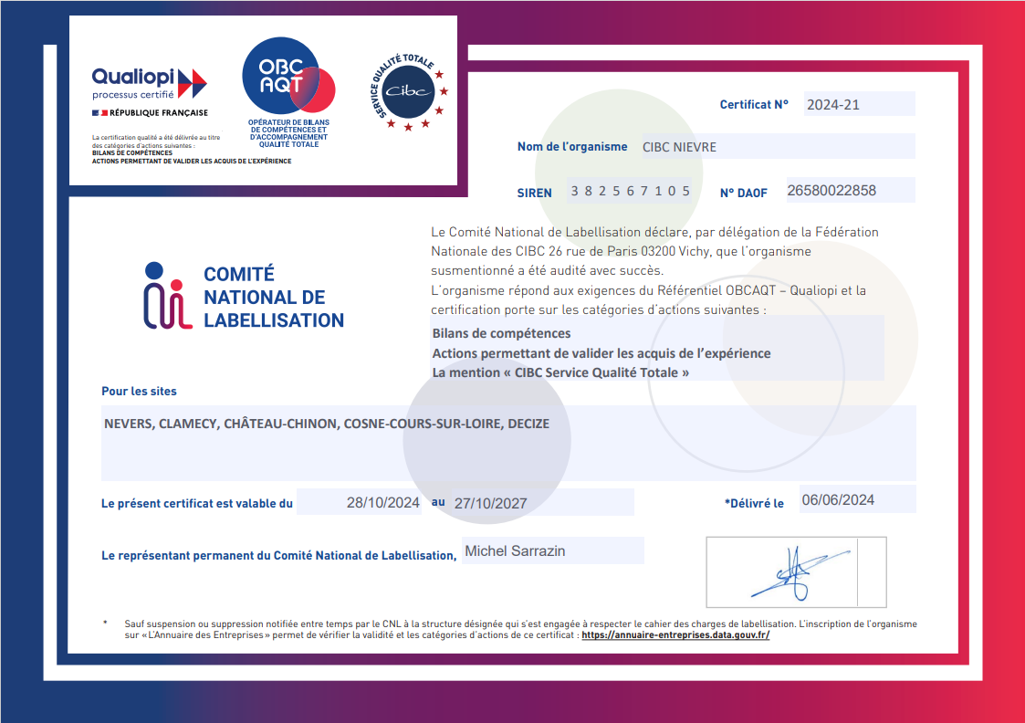 Après avoir obtenu trois labels service qualité totale entre 2008 et 2020, le Comité National de Labellisation a délivré au CIBC le label OBCAQT, Opérateur de Bilan de Compétences et d’Accompagnement Qualité Totale, en tant qu’opérateur de bilans de compétences. Mais aussi, le CIBC vient d’être certifié Qualiopi Formations, pour rentrer dans un nouveau champ de compétences, à savoir la formation.